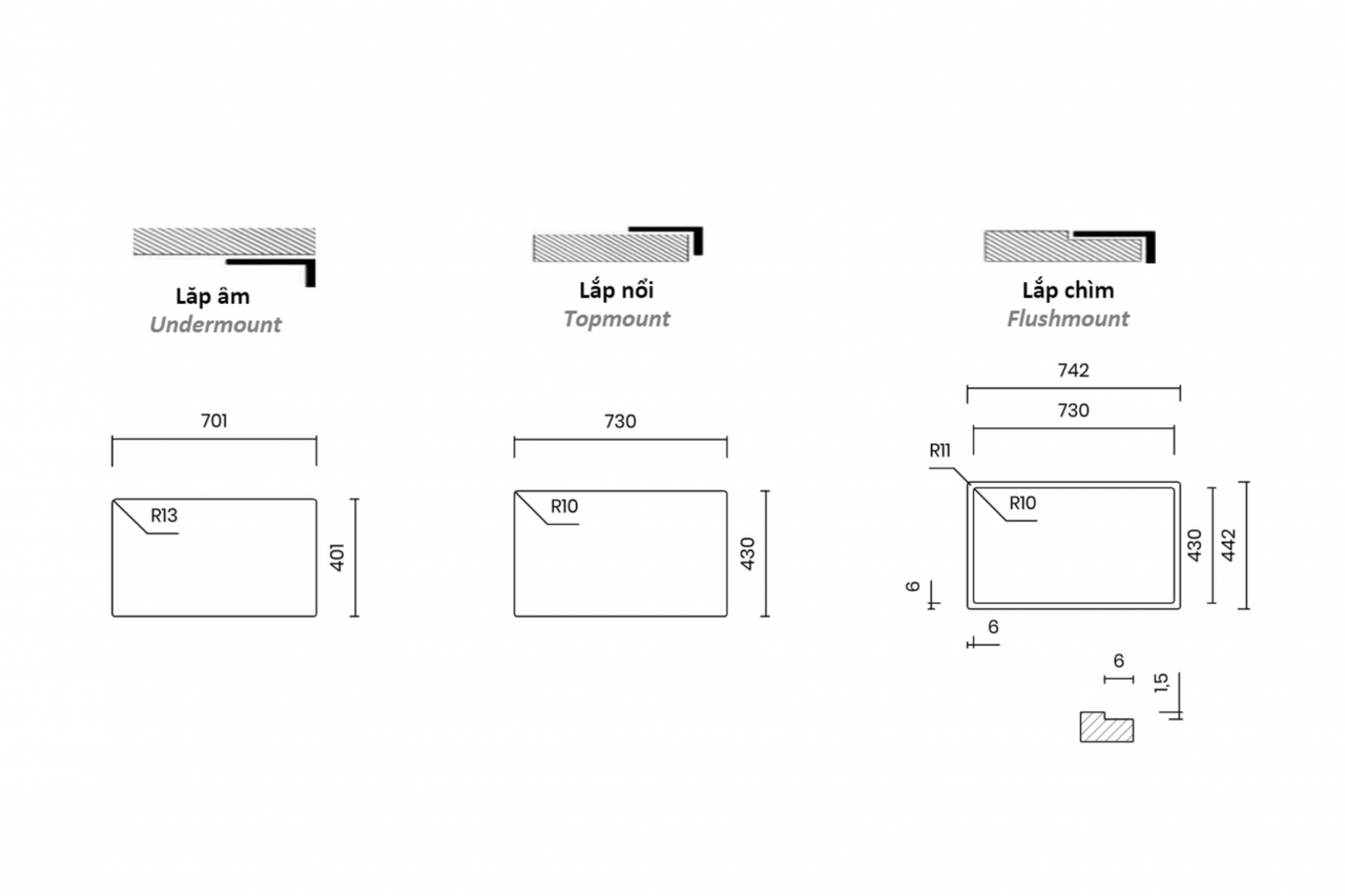 - Bo góc trong: 12 mm